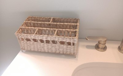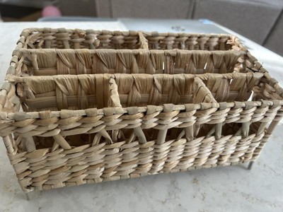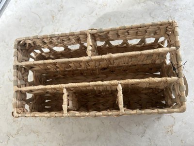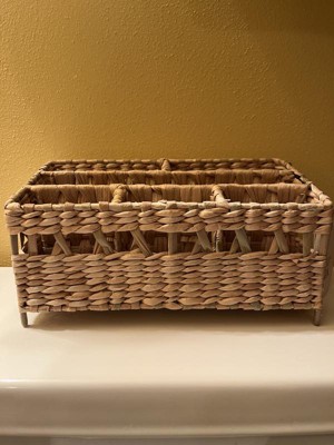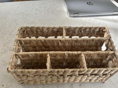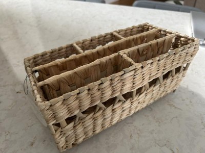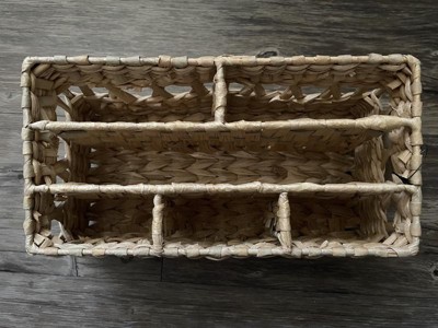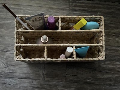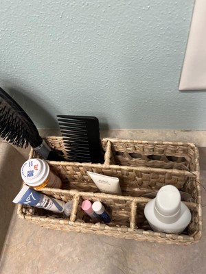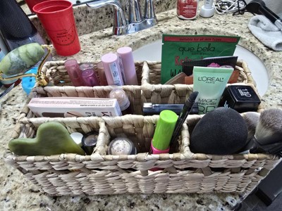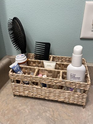 I wanted to love this cute woven wicker organizer for my bathroom, but I just can't. It has enough sections for many things, but the sections are very narrow. It was hard to fit anything other than a hairbrush or a tall, slim bottle or tube in it. I will use it as a small decor with dried flowers in it instead.
