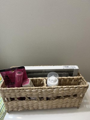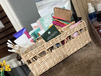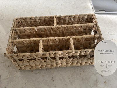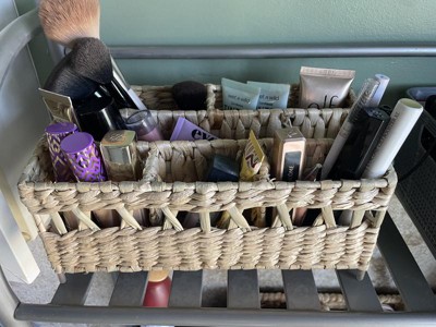 The Natural Woven Makeup Organizer by Threshold is a lightweight, simple organizer basket made of handwoven cattail leaves. While this organizer fits well on a tight vanity space, the basket space openings are small and can only accommodate certain sizes of beauty products.