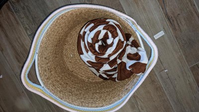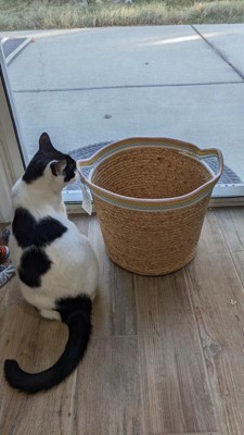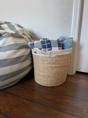 Your kid's space won't be messy anymore when you add this Natural Woven Round Storage Bin with Coiled Rope Handle from cloud island™. This round storage bin features the appeal of a textured woven design and artful style that makes it a beautiful addition to their decor. Coiled rope in white, yellow and blue along the rim provides a colorful look that complements its natural shade. Use this large storage bin to stash away blankets, toys and other items to help keep their space neat and tidy. You can also add other woven storage bins of varying sizes and designs to create a coordinated look while giving their room extra storage space.