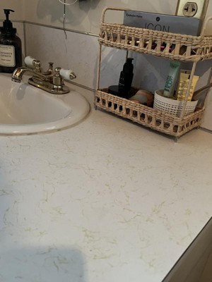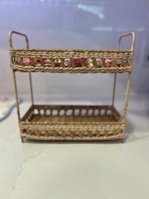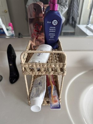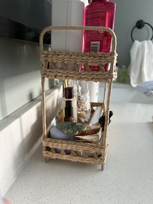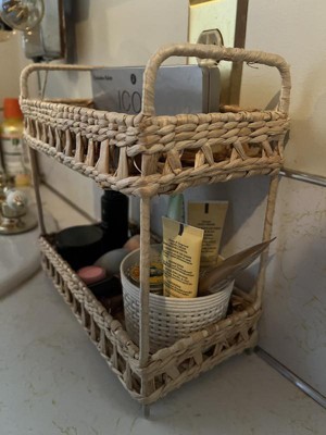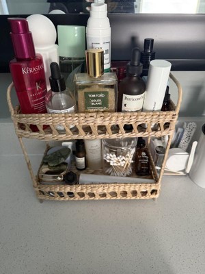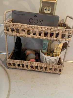 This two tier shelf is so cute, I love the visual appeal it adds to my bathroom. It's not huge so it doesn't take up my whole counter top but it can fit a lot of my products on its two shelves. The woven, neutral color looks cute in any space and I have all my skincare and makeup stacked on it.