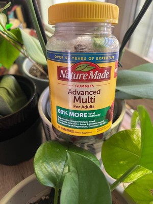 Nature Made Advanced Multi for Adults Gummies provide 20 key nutrients for daily nutritional support. It’s both a womens multivitamin and a mens multivitamin, providing 60% more total nutrients(1) in tasty gummies plus a good source of Magnesium Citrate and Calcium and an excellent source of all 8 B Vitamins. This adult multivitamin provides nutrients to support brain, heart and immune function, bone and muscle health, and energy metabolism (2). These daily vitamin gummies are gluten free with no artificial flavors, no high fructose corn syrup, and no synthetic dyes – color derived from natural source. These gummy vitamins for women & vitamins for men are in a tasty mixed berry with other natural flavors. Adults, chew 3 gummies daily. Start your day with womens vitamins and mens vitamins from Nature Made. (1) As compared to Nature Made Multi Gummies (2) Helps convert food into cellular energy.CAUTION: Take only as directed. If you are taking medication, consult your physician before use.These statements have not been evaluated by the Food and Drug Administration. This product is not intended to diagnose, treat, cure, or prevent any disease.