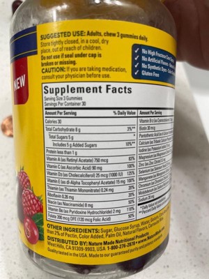 - Mixed Berry with other natural flavors; Adults, chew 3 vitamin gummies daily