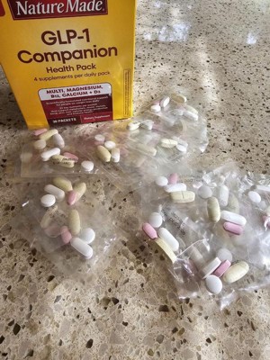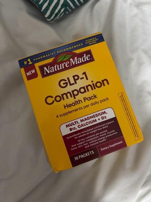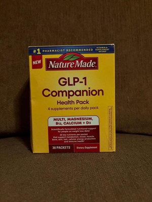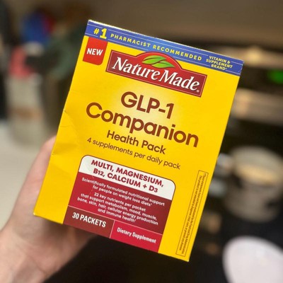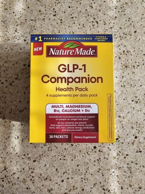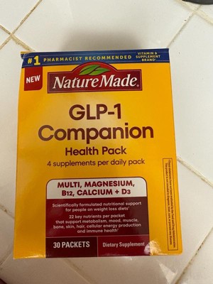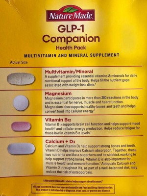 Nature Made GLP-1 Companion Health Pack provides 4 supplements per daily pack. Daily womens multivitamin / mens multivitamins will provide essential vitamins and minerals for daily nutritional support of the body and help fill the nutrient gaps associated with weight loss diets. Magnesium supplement (as Magnesium Oxide) supports nerve, muscle and heart function, healthy bones and teeth, and helps convert food into cellular energy. D3 Vitamin supports immune health and helps improve Calcium absorption. Calcium supplement for women and men helps support strong bones and teeth. B12 vitamins help support a healthy mood (1), brain cell function and reduce fatigue for those low in B12. Each packet provides scientifically formulated nutritional support during weight loss for women and men and while on GLP1 medications. (1) Adequate Vitamin B12 status helps support a healthy mood. *Based on a 2024 survey of pharmacists who recommend branded vitamins and supplements.CAUTION: Consult your physician before use if you are pregnant, nursing, have kidney disease, blood clotting issues, or are taking medications. People with diabetes or any chronic condition should consult a physician before purchasing or taking any supplements.These statements have not been evaluated by the Food and Drug Administration. This product is not intended to diagnose, treat, cure, or prevent any disease.