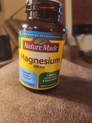 These Nature Made Magnesium Oxide 250 mg Tablets are dietary supplements designed to support muscle relaxation, heart health, bone health and nerve health. These Magnesium supplements are sourced from high-quality ingredients. Nature Made Magnesium 250 mg Tablets are gluten free and contain no synthetic dyes and no artificial flavors. These Nature Made Magnesium tablets provide Magnesium Oxide to help relax the body. With over half of the U.S. population not consuming enough Magnesium in their diet, this Magnesium supplement for women and men helps to contribute to the Magnesium your body needs (1). Adults take one of these Nature Made Magnesium 250mg tablets daily with water and a meal. Nature Made supplements are quality you can trust. (1) Reider, C.A.; Chung, R.-Y.; Devarshi, P.P.; Grant, R.W.; Hazels Mitmesser, S. Inadequacy of Immune Health Nutrients: Intakes in US Adults, the 2005–2016 NHANES. Nutrients 2020, 12, 1735. *Based on a survey of pharmacists who recommend branded vitamins and supplementsCAUTION: If you have kidney disease or are taking any medication, consult your physician before use.These statements have not been evaluated by the Food and Drug Administration. This product is not intended to diagnose, treat, cure, or prevent any disease.