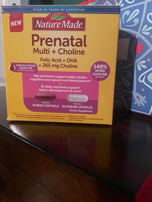 - Prenatal nutritional support supplement: contains one 60 count bottle of Nature Made Prenatal Softgels + one 60 count bottle of Choline Capsules for a 60-day supply