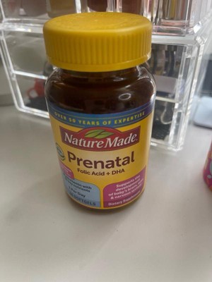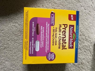 Nature Made’s Prenatal Multi + Choline supplement provides 21 daily nutrients to support baby’s development and mom. This womens prenatal multivitamin + Choline capsule provides key nutrients to support baby’s brain, cognitive and spinal cord development(1). Folic Acid supports the development of baby’s nervous system. DHA is an Omega-3 fatty acid that helps support baby’s brain and eye development. Choline supports baby’s brain and spinal cord development. 95% of pregnant women do not meet the recommended intake level of Choline. Prenatal vitamins for women also provide nutritional support for mom. Adults, take 1 Prenatal multivitamin softgel and 1 Choline capsule daily with water and a meal for optimal absorption. This Prenatal multivitamin supplement plus Choline has no synthetic FD&C dyes and is gluten free. Start your day with Prenatal vitamin and Choline supplements from Nature Made. (1) When taken as suggested. (2) Compared to the leading 2 pill prenatal multivitamin at date of manufacture. (3) Circana Panel data, Total US - All Outlets for 52 weeks ending Dec-23-2023.WARNING: Accidental overdose of iron-containing products is a leading cause of fatal poisoning in children under 6. Keep this product out of reach of children. In case of accidental overdose, call a doctor or poison control center immediately.CAUTION: If you are taking medication or have blood clotting issues, consult your physician before use.These statements have not been evaluated by the Food and Drug Administration. This product is not intended to diagnose, treat, cure, or prevent any disease.