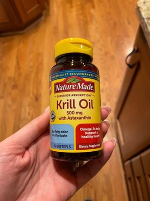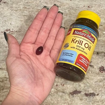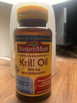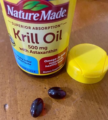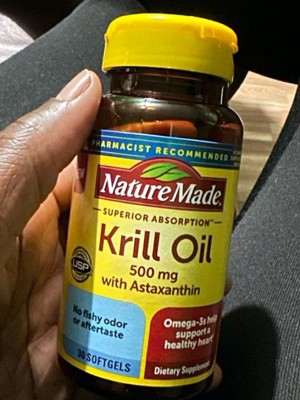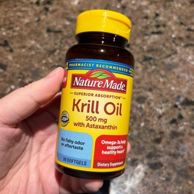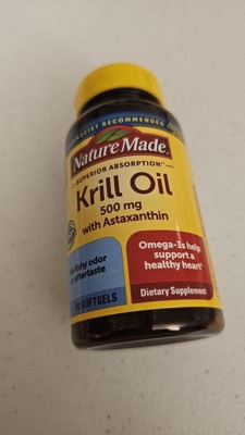 Nature Made Superior Absorption(1) Krill Oil 500mg with Astaxanthin softgels help support a healthy heart. One daily softgel provides 500mg of Krill Oil, including 120 mg of total Omega-3 fatty acids, with 60 mg EPA and 30 mg DHA per serving. This Antarctic Krill Oil supplement is not fish oil from fish, it is sourced from krill, small shrimp-like crustacean shellfish found in the Antarctic Ocean. Krill Oil is bound to phospholipids, making it easier to absorb than fish oil bound to triglycerides(1). This Omega 3 supplement is gluten free with no color added. Adults, take 1 softgel daily with water and a meal. Start your day with heart health support from Nature Made. USP has tested and verified ingredients, potency and manufacturing process. USP sets official standards for dietary supplements. Visit the USP verified website for more information. (1)Superior omega-3 fatty acid (EPA + DHA) absorption compared to equal amount of EPA + DHA from regular triglyceride fish oil. *Based on a 2022 survey of pharmacists who recommend branded vitamins and supplements.CAUTION: If you are pregnant, nursing, taking medications, or have blood clotting issues, consult your physician before use.These statements have not been evaluated by the Food and Drug Administration. This product is not intended to diagnose, treat, cure, or prevent any disease.