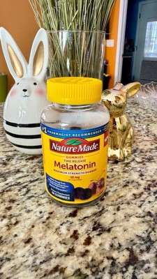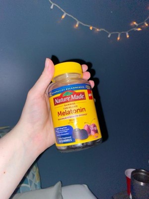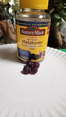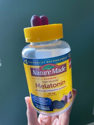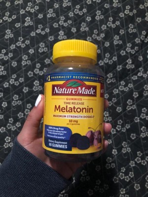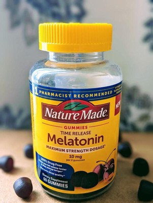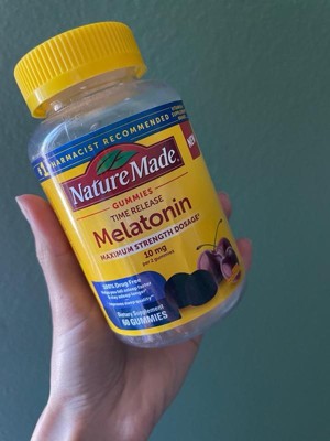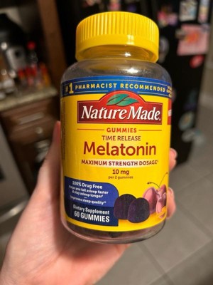 Nature Made Maximum Strength Dosage(1) Time Release Melatonin 10mg Gummies (10 mg in a 2-gummy serving) improves sleep quality(2). Our time release formula, now in gummies, provides Melatonin to help you fall asleep faster and slowly extends the release of Melatonin to help you stay asleep longer. This 100% drug free sleep supplement is gluten free with no artificial flavors, no high fructose corn syrup, no artificial sweeteners and no synthetic dyes – color derived from natural source. In a tasty cherry flavor with other natural flavors, adults chew 2 Melatonin 10 mg gummies (per 2 gummies) one hour before bedtime. Do not exceed 2 gummies daily. Keep out of reach of children. Store tightly closed, in a cool, dry place. With Nature Made occasional sleep aids, a good tomorrow starts tonight. (1)Compared to Nature Made Melatonin Gummies. (2)Time release Melatonin improves sleep quality. *Based on a 2022 survey of pharmacists who recommend branded vitamins and supplements.WARNING: Do not use this product, unless advised by a physician, if you are pregnant, attempting to become pregnant, nursing, taking any medications, or have any chronic medical conditions. Do not drive or operate machinery within eight hours of taking this product or if you feel groggy. For occasional sleeplessness only; consult your physician if you continue to experience sleep difficulties or for use beyond two months. Not intended for individuals under the age of 18 years.These statements have not been evaluated by the Food and Drug Administration. This product is not intended to diagnose, treat, cure, or prevent any disease.