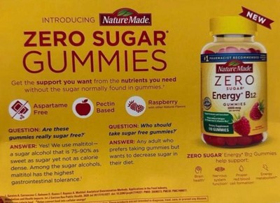 Nature Made® Zero Sugar‡ gummies have zero grams of sugar per serving‡ and provide the same benefits and great taste as our regular gummies. Our sugar free gummies‡ are sweetened with sugar alternatives and are free of aspartame, making these Zero Sugar‡ gummies a great choice for adults who are interested in reducing their added sugar intake. From the #1 Pharmacist Recommended Vitamin & Supplement Brand.*