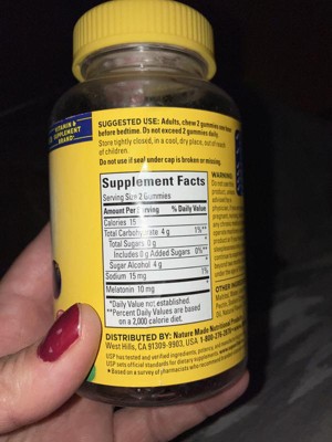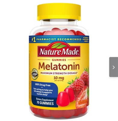 The gummies you love now with zero sugar!(1) Nature Made Zero Sugar (1) Melatonin Gummies provide Melatonin 10 mg per 2 gummies to help you fall asleep faster and support restful sleep. Melatonin is a hormone found naturally in the body that helps to regulate sleep and wake cycles. This 100% drug free sleep supplement is pectin based, gluten free and aspartame free with no artificial flavors, no high fructose corn syrup and no synthetic dyes – color derived from natural source. Best of all, our Melatonin gummies 10mg adult have no sugar (1) and come in a tasty mixed berry with other natural flavors. Adults, chew 1 gummy one hour before bedtime; do not exceed 2 gummies daily. Keep out of reach of children. Store tightly closed, in a cool, dry place. With Nature Made occasional sleep aids, a good tomorrow starts tonight. (1)Not a low calorie food (2)Compared to Nature Made Melatonin Gummies *Based on a 2022 survey of pharmacists who recommend branded vitamins and supplements.WARNING: Do not use this product, unless advised by a physician, if you are pregnant, attempting to become pregnant, nursing, taking any medications, or have any chronic medical conditions. Do not drive or operate machinery within eight hours of taking this product or if you feel groggy. For occasional sleeplessness only; consult your physician if you continue to experience sleep difficulties or for use beyond two months. Not intended for individuals under the age of 18 years.These statements have not been evaluated by the Food and Drug Administration. This product is not intended to diagnose, treat, cure, or prevent any disease.
