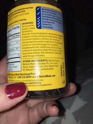 I purchased a bottle of 70 because I believed that Nature Made was a high quality product. but within hours of taking one 5mg gummy I had pulsing in the veins on the left side of my head. It went away after a day so on the third day I took another and immediately it happened again. I then googled "Sugar Alcohol" and saw that 2 of the 6 types of Sugar Alcohol can cause clotting. I have thrown the bottle away.