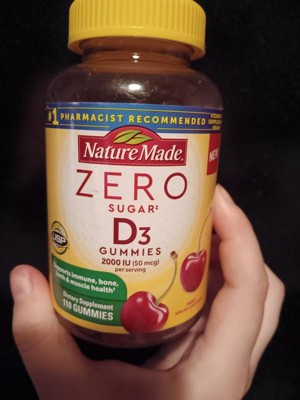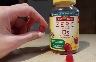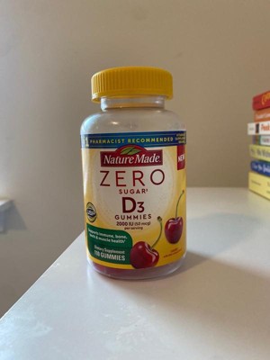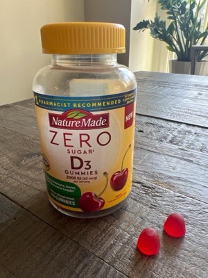 The gummies you love now with zero sugar!(1) Nature Made Zero Sugar(1) Vitamin D3 Gummies for adults provide Vitamin D 2000 IU (50 mcg) per serving. D3 Vitamin is an essential nutrient that supports immune, bone, teeth and muscle health. These Vitamin D gummies for women and men are pectin based, gluten free and aspartame free with no artificial flavors, no high fructose corn syrup and no synthetic dyes – color derived from natural source. Best of all, our sugar free Vitamin D gummies for adults have no sugar(1) and come in a tasty cherry with other natural flavors. Adults, chew 2 gummies daily. Start your day with sugar free Vitamin D supplements (1) from Nature Made. USP has tested and verified ingredients, potency and manufacturing process. USP sets official standards for dietary supplements. Visit the USP verified website for more information. (1)Not a low calorie food. *Based on a 2022 survey of pharmacists who recommend branded vitamins and supplements. These statements have not been evaluated by the Food and Drug Administration. This product is not intended to diagnose, treat, cure, or prevent any disease.CAUTION: Take only as directed. If you are taking medication, consult your physician before use.These statements have not been evaluated by the Food and Drug Administration. This product is not intended to diagnose, treat, cure, or prevent any disease.