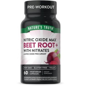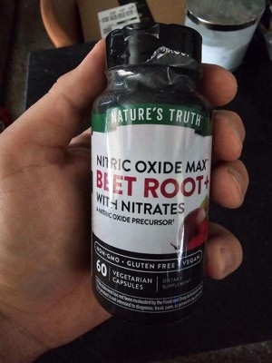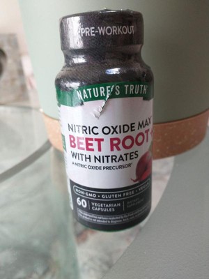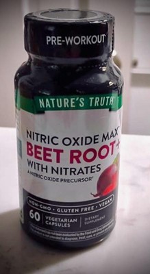 Nature’s Truth Beet Root + capsules with nitrates deliver a 3,000 mg Nitric Oxide Precursor blend of beet root powder, beet root extract equivalent, and grape seed extract equivalent. One capsule also supplies an excellent source of Vitamin C, Niacin, and Vitamin B-12, and is ideal for men and women to take between meals up to two times daily. Nature’s Truth: Where Wellness Begins