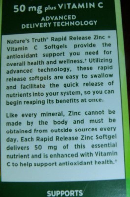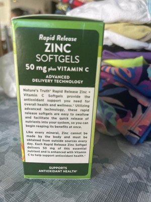[This review was collected as part of a promotion.] I love the Nature's Truth Vitamins Rapid Release Zinc 50mg + Vitamin C. They contain 90mg (100% Daily value Vitamin C) And 50mg Zinc (455% Daily Value of Zinc) which are both excellent antioxidant for your immune health & overall health. These are softgels, which are my preferred vitamin, easily and quickly absorbed by your body. The softgels are small and easy to swallow too. This bottle contains 120 vitamins. I recommend these vitamins, I like the the zinc is paired with the vitamin c for better efficiency of both vitamins!