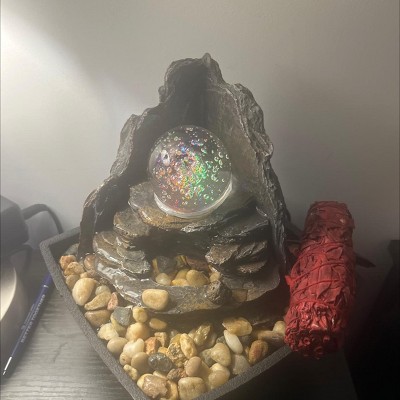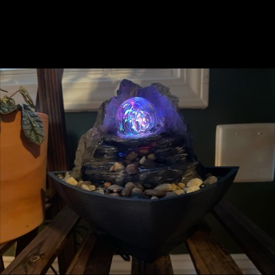 The soothing water sounds, and modern look of the Rock Formation Tabletop Water Fountain by Nature Spring brings tranquility, relaxation and beauty to your living or work area. The indoor fountain features a polyresin construction for durability, flowing layers of natural looking rock formations for water to fall over, a rolling glass ball water feature, multi-colored LED lights and a built-in electric pump. Whether you use this fountain as a decoration on a desk in your office, in the corner of the kitchen or on a small shelf in the living room, the soothing sounds of this table top fountain are sure to leave a lasting impression!