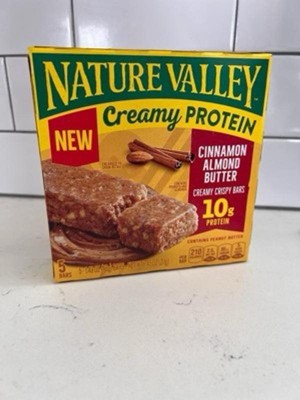 - CONTAINS: One regular cardboard box of Nature Valley Creamy Protein Bars, Cinnamon Almond Butter, 5 Bars, 7.45 oz; Perfect for instant snacking