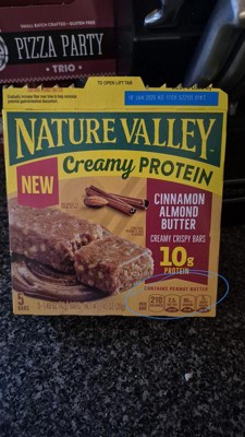 Indulge in a creamy, crispy bar that provides 10g protein per serving. Nature Valley Creamy Protein Cinnamon Almond Butter Bars bring the best of both worlds: creamy and crispy texture in every bite! These snack bars are made with delicious ingredients including almond butter, peanut butter, whole grain oats, and cinnamon flavored bits. They're made without artificial flavors, artificial colors, or high fructose corn syrup. Reach for one of these individually wrapped bars for a satisfying snack during your afternoon break. Make them your go-to for easy lunch box treats or after school snacks. Or take a box along to share with the family when camping or conquering a new trail. Whether you're heading off the beaten path or on your work commute, our on the go snacks are an ideal choice. At Nature Valley, we believe that what you put in is what you get out. So wherever the moment takes you and your family, you can rely on our great-tasting snacks to help keep you going. Contains one regular cardboard box of Nature Valley Creamy Protein Bars, Cinnamon Almond Butter, 5 Bars, 7.45 oz; perfect for instant snacking.