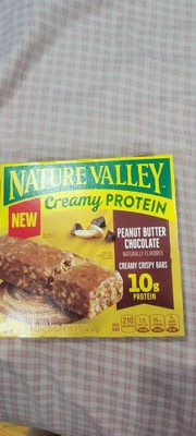 Indulge in a creamy, crispy bar that provides 10g protein per serving. Nature Valley Creamy Protein Peanut Butter Chocolate Bars bring the best of both worlds: creamy and crispy texture in every bite! These snack bars are made with delicious ingredients including peanut butter, peanuts, whole grain oats, and semisweet chocolate. They're made without artificial flavors, artificial colors, or high fructose corn syrup. Reach for one of these individually wrapped bars for a satisfying snack during your afternoon break. Make them your go-to for easy lunch box treats or after school snacks. Or take a box along to share with the family when camping or conquering a new trail. Whether you're heading off the beaten path or on your work commute, our on the go snacks are an ideal choice. At Nature Valley, we believe that what you put in is what you get out. So wherever the moment takes you and your family, you can rely on our great-tasting snacks to help keep you going. Contains one regular cardboard box of Nature Valley Creamy Protein Bars, Peanut Butter Chocolate, 5 Bars, 7.45 oz; perfect for instant snacking.