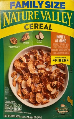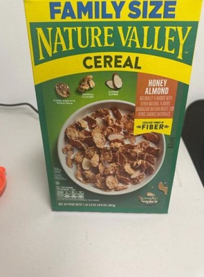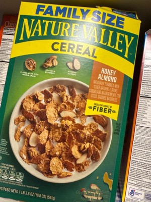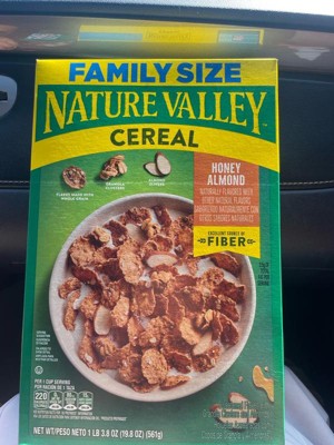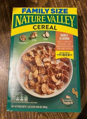 - CONTAINS: One cardboard box of crunchy Nature Valley Honey Almond Cereal, Family Size, 19.8 oz; Perfect for instant snacking, or a part of breakfast and meals
