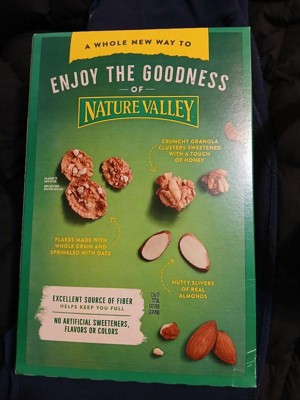 - NATURE VALLEY CEREAL: Another delicious way to enjoy the goodness of Nature Valley; A mix of crunchy granola clusters sweetened with a touch of honey, flakes made with whole grain and sprinkled with oats, and nutty slivers of real almonds