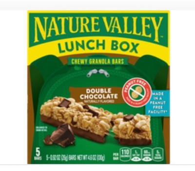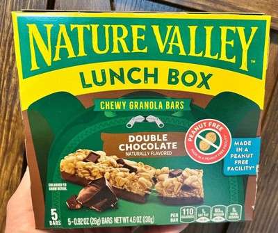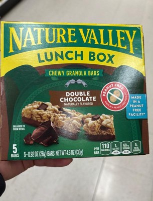- CONTAINS: One regular cardboard box of Nature Valley Double Chocolate Peanut-Free Chewy Granola Bars, five bars, 4.6 oz; Perfect for instant snacking