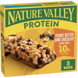 - CONTAINS: One regular cardboard box of Nature Valley Protein Chewy Bars, Peanut Butter Dark Chocolate, 5 bars, 7.1 oz; Perfect for instant snacking