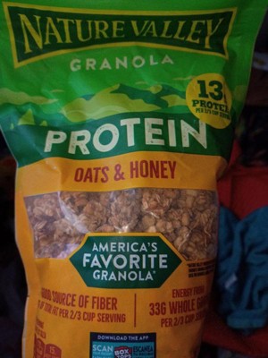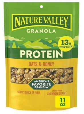 Fuel your adventures any time, any place with Nature Valley Protein Oats and Honey Granola, America's favorite granola.* The taste of sweet honey and the goodness of granola made with whole grain oats are a wholesome way to kick-start your day. Each 2/3 cup serving provides 13g of protein and energy from 33g whole grain (at least 48g recommended daily), plus a good source of fiber (7g of total fat per 2/3 cup serving). Plus, the crunchy oats and honey granola clusters have no artificial flavor or colors, and no high fructose corn syrup. So whether you enjoy a bowlful as a breakfast cereal or take along the pouch for family snacks on the run, this honey granola mix delivers on the go energy. Add your own fruit and nut combination for DIY trail mix. Sprinkle the Nature Valley granola clusters over a yogurt parfait or acai bowl for serious crunch. This pouch of loose granola cereal is resealable for easy school snacks or part of breakfast on the go. At Nature Valley, we believe that what you put in is what you get out. So wherever the moment takes you and your family, you can rely on our great-tasting snacks to help keep you going, whenever and wherever you need it. Contains one plastic pouch of crunchy Nature Valley Protein Oats and Honey Granola, 11 oz; perfect for instant snacking, or a part of breakfast and meals. *Nature Valley Protein Oats and Honey is America's favorite granola based on 52 weeks of Nielsen Sales Data for granola ending 2/10/2025.