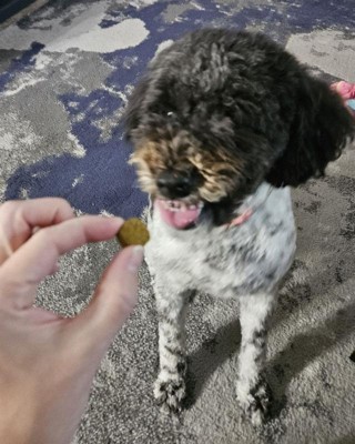 [This review was collected as part of a promotion.] It is very hard to get a picture of my dog eating these because she snatches it out of my hand before I can take the picture! They definitly seem like treats to her more so than allergy care. There are 70 in the package and I give her 2 per day. She consistently takes them in the morning. I like that they have pumpkin powder in them and other natural ingredients. They don't smell the greatest in my opinion, but I am not eating them. I am also not sure how well they work yet but no complaints at all. She seems to be doing good with them so I am going to keep giving them to her for her sneezing and to see if they help with skin moisture and respiratory health. Overall these seem like a great product.