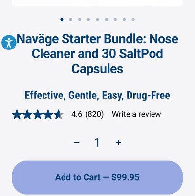 - The Navage Starter Bundle includes the Naväge Nose Cleaner, 30 Original SaltPod capsules, 1 pair of Standard Nose Pillows and pre-installed batteries that last UP TO ONE-YEAR, depending on frequency of use, with no need to recharge.