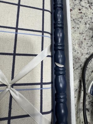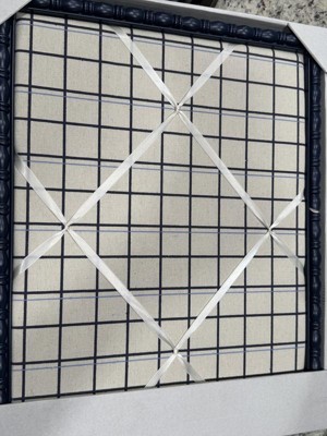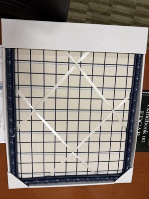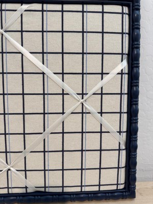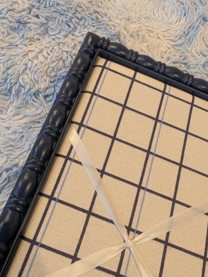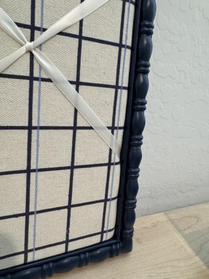 Display your kid's favorite photos, drawings and more with this Navy Framed Fabric Photo Memo Board from Pillowfort™. This memo board features a checkered surface and crisscross ribbon ties to easily attach their notes, artwork, pictures and more. Featuring a navy frame and a traditional design, this memo board comes with hooks at the back for easy installation.