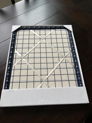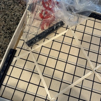 This 20x16-inch padded memo board boasts a stylish and elegant design, making it a great addition to any home or office decor. However, there are a few things to consider before purchasing. First, this is a padded memo board, not a corkboard. It’s designed for tucking notes, photos, or mementos between the crisscrossed ribbons rather than using pushpins. The ribbons are tacked down at certain points, restricting the space available for larger items—anything over 7”x7” may not fit without pulling the ribbon out of place (see my pics for reference). Pros: * Elegant, ornate frame made of hard resin * Neutral light beige canvas fabric complements various decor styles * Versatile hanging options (can be mounted vertically or horizontally) * No need for tacks or pins Cons: * Fabric may sag over time especially if you hang something heavy with a thumbtack * Standard pushpins are too long and stick out * Not ideal for heavy items or anything larger than 7”x7” when using the ribbon to hold it in place Overall, this memo board is a stylish and cute that works best for light use, but it may not be the most practical choice for those needing a more secure or spacious display option.