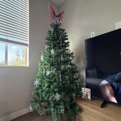 I got this 6 ft tall tree cause it was $65.99 at the time of purchase (Black Friday Deal). It shed a little bit when you set it up. It’s bare, but once you add decorations it looks better. It also comes with pre-attached lights with different light effects (e.g., flickering, glowing, etc.). It’s an okay tree.