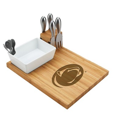 NCAA TexasUniversity at Austin Longhorns bamboo cheese board set, includes: Stainless steel serving tools, Cheese Knives (2), Cheese spreaders (1), Cheese fork (1), cocktail sticks (4) and removable ceramic dish with unique holder for the cocktail/olive sticks (1). Magnetic strip on board securely holds tools when not in use. The bowl fits into a recess milled into the board for stability. Designed by Picnic at Ascot in the USA.