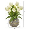 Incorporate spring coloring year-round with this arrangement of artificial tulips boasting bright cheerful blooms, handsomely complemented with dark, realistic leaves. Reaching 15” high from a decorative vase, it makes for an enchanting accent all year round.