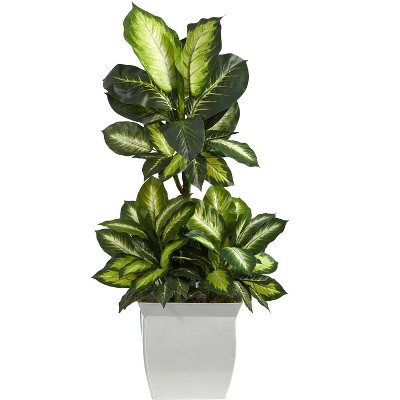 Nearly Natural 2-ft Golden Dieffenbachia Artificial Plant in White Metal Planter