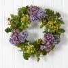 Liven up your home with this lovely multihued hydrangea wreath. A creamy mix of vibrant buds and blooms make this decorative piece a summer sensation. Soft colored pom-pom style flowers surrounded by rich foliage create a look that's subtle yet inviting. A full 24 inches round, this ornamental masterpiece is a nice focal point for a living room wall or display it on your front doorway to welcome guests.
