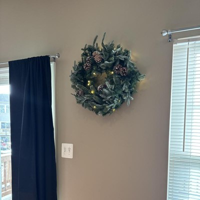 Light up your favorite seasonal accents while adding serious curb-side appeal with this artificial wreath intricately designed from a rich collection of pine foliage, carefully accented throughout with faux pinecones that look incredibly lifelike - all frosted with a hint of faux snow. Arriving pre-strung with 35 clear LED lights to effortlessly illuminate either a wall or door, this 24” (in circumference) decorative wreath makes for an inviting accent and will undoubtedly transform any entrance all throughout the holiday season..