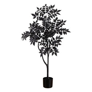 Bring a burst of eternal Halloween to your space with our artificial black sumac tree. The tree's slender trunk stands firm, giving rise to a display of black foliage that's eerie yet tranquil, arranged just so to evoke the feeling of a crisp, autumn day. Housed in a black pot, this minimalist tree complements any decor scheme, inviting a Halloween warmth that's always in season. Crafted from high-quality materials, feel free to bend the branches. Standing 4-Ft from a nursery pot, DIY and add in a planter of your choice. Whether it graces a quiet reading nook or brightens a bustling office, this sprouting tree remains a vibrant piece to the fall season.