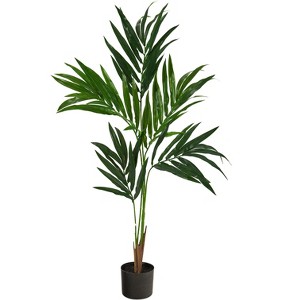 Brighten up the tightest spaces with this artificial tree boasting several tiers of kentia palm foliage, intricately designed from the finest materials to reflect a lifelike realism throughout its natural occurring details. Standing 4'” high from an accompanying nursery planter, this tropical-inspired fake palm tree would be perfect for freshening up a bare corner in your home or office.