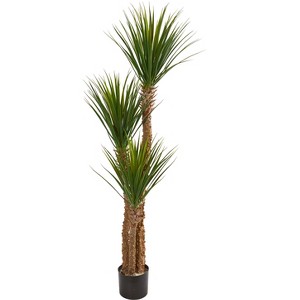 Slim and compact, this yucca artificial tree stands at 57 inches with its three thick and textured trunks. Atop these trunks are thin and sharp green leaves that are arranged to extend upwards. With its compact appearance, this artificial tree will bring color and texture to any corner in your home or office. Settle this tree in an intricately patterned vase to add some interest to its overall look.