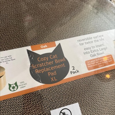 So my cat loves (LOVES) this scratcher bowl, but I really needed to replace the cardboard pad—she is truly passionate about both napping in it and destroying it. So much love, you could feel it, lol. I was excited to order these replacement pads, but I was befuddled when they arrived. First, they were XL, not L (as labeled in the specifications above); and second, these pads were flat, not domed, as they needed to be for this scratcher bowl to be—well—A BOWL. Target made this an easy return (thank you!) but I am extremely disappointed about this item, which the manufacturer label itself claims to be the replacement pads for the scratcher bowl, YET are not bowl- or dome-like at. all. If I wanted a flat piece of corrugated cardboard for my cat to scratch, there are plenty on the market. What I NEED is a curved scratcher designed to fit in this bowl that my cat loves so much… and this item was strangely not it (even though by every indication, it should be?).