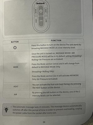 Great! So relaxing. I like the 3 different modes! There is massage, compression and then both. It’s nice you can turn the heat on or off. The heat doesn’t get too hot and is very comfortable. The massage is nice and gentle and goes across your whole foot. The compression mode feels good and is like a blood pressure sleeve that moves across your foot and heel. I feel this really helps my circulation and is very relaxing and easy to use. Just plug it in and turn it on! I use this at my desk when I work, at night while watching TV and sometimes before bed. The buttons are easy to use and the instruction book is very helpful! The mode button changes colors to show which mode it’s in. Small suction cups on the bottom help hold it in place when using it on a hard wood floor. My daughter used it while healing from surgery. Great gift for someone as well!