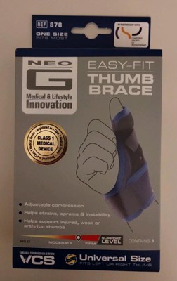 [This review was collected as part of a promotion.] I just love the NEO G Easy-Fit Thumb Brace. I suffer from arthritis in my lower thumbs and the NEO G Thumb Brace has given me the much need relief and support I needed. Super easy to put on and adjust to your desired compression with the simple to use Velcro wrap straps. Not bulk and can be worn during most activities. Unisex on size fits most I am Male and have XL hands and fits me well and fits left or right hands. I would highly recommend for anyone needing thumb support and looking for relief. The item description was just as described and I would buy it again.