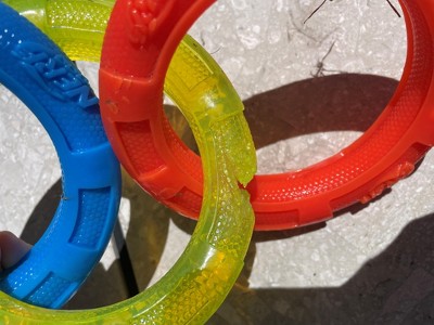 Don’t buy! My dog chewed the blue ring into pieces in just a few minutes, and ingested most of it. Plastic shat.