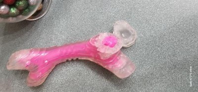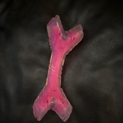 Our dog loved the toy and wanted to play with it; but he's a 115 pound Rottweiler and the Nerf bone did not hold up. He chewed through the clear part in about 20 minutes and almost tore a piece off. He also chewed into the pink center bone and has a piece ready to come off it as well. If you have a powerful chewer, this toy isn't for your dog. The bone does smell similar to a smoky bacon.