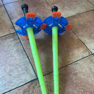 Get battle ready and challenge a friend with the new NERF Fencing Duel Swords Set! This set comes complete with (2) NERF retractable swords. The soft foam tipped swords feature hand guards that come with built in targets for challenging game play. Each hand guard comes with 4 targets, if your opponent hits a target, it drops down. Eliminate all four of your opponent's targets and you win! These kid-friendly swords are perfect for safe duels for kids of all ages. Plus, each sword has a battery-powered LED light inside so you can turn off the lights and duel in the dark! So find a battle partner and grab yourself a NERF Fencing Duel Set today! Requires (6) AAA batteries (not included)