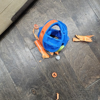 our bulldog loved the noise and fetching it when it rolled all over. within a day or two he ripped off a piece of the orange belt. I had to take it away and I will not be buying another one.