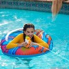 - READY, AIM, SOAK! No need to hold a separate blaster. This inflatable ride-on is designed with a built-in, pool-fed mega blaster to provide continuous water supply so you never have to waste time re-filling your blaster!