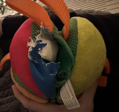 Purchased cause you know "nerf tough" and thought it would be great for my dog cause it's big enough to not roll under the couch, squeaks, crunches, and has straps to play with. While known as a destroyer of toys over weeks, if not months, of owning them, this was a special case. Just carrying it, his teeth were tearing through the orange fabric. It's not durable, is super thin, and I could almost poke it apart with my fingers. Then, when he played tug with his ball, the whole bottom-side opened up into this giant, multi-inched size hole that was spilling fluffing. It took no time and this thing practically dissolved. Super disappointed and would not recommend or purchase again.