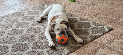My 100 lb boxer loves this ball. My ears don't feel the same way. Lol